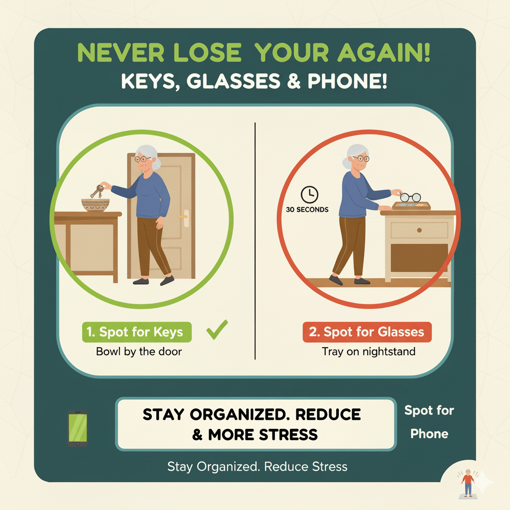 Tired of searching for your keys, glasses, or phone? Here's the trick: Choose one specific spot for each item and commit to it for two weeks. Put a small bowl by the door for keys, a tray on your nightstand for glasses, a specific counter spot for your phone.